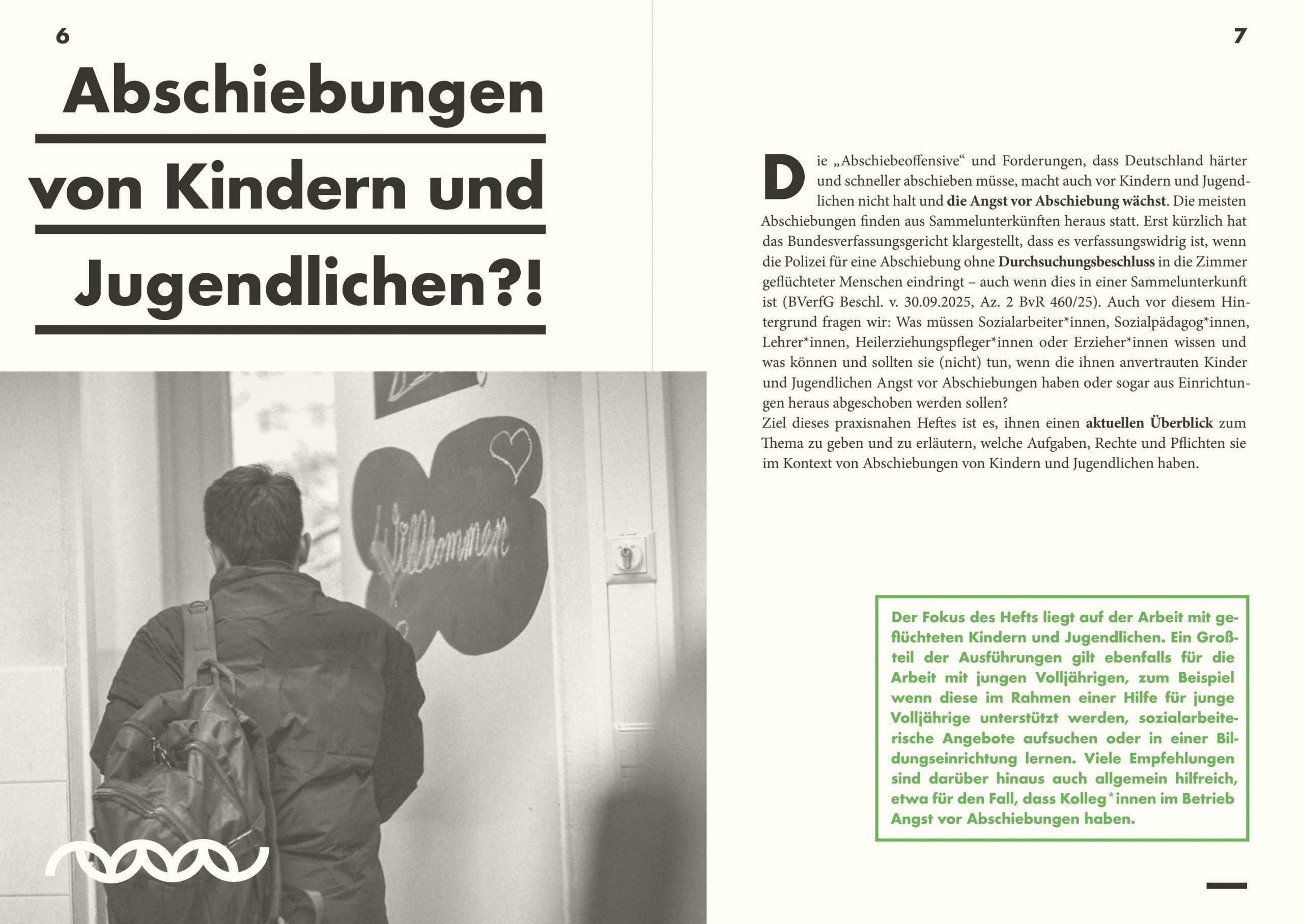 Die „Abschiebeoffensive“ und Forderungen, dass Deutschland härter und schneller abschieben müsse, macht auch vor Kindern und Jugendlichen nicht halt und die Angst vor Abschiebung wächst. Die meisten Abschiebungen finden aus Sammelunterkünften heraus statt. Erst kürzlich hat das Bundesverfassungsgericht klargestellt, dass es verfassungswidrig ist, wenn die Polizei für eine Abschiebung ohne Durchsuchungsbeschluss in die Zimmer geflüchteter Menschen eindringt – auch wenn dies in einer Sammelunterkunft ist (BVerfG Beschl. v. 30.09.2025, Az. 2 BvR 460/25). Auch vor diesem Hintergrund fragen wir: Was müssen Sozialarbeiter*innen, Sozialpädagog*innen, Lehrer*innen, Heilpädagog*innen oder Erzieher*innen wissen und was können und sollten sie (nicht) tun, wenn die ihnen anvertrauten Kinder und Jugendlichen Angst vor Abschiebung haben oder sogar aus Angst ausreisen?