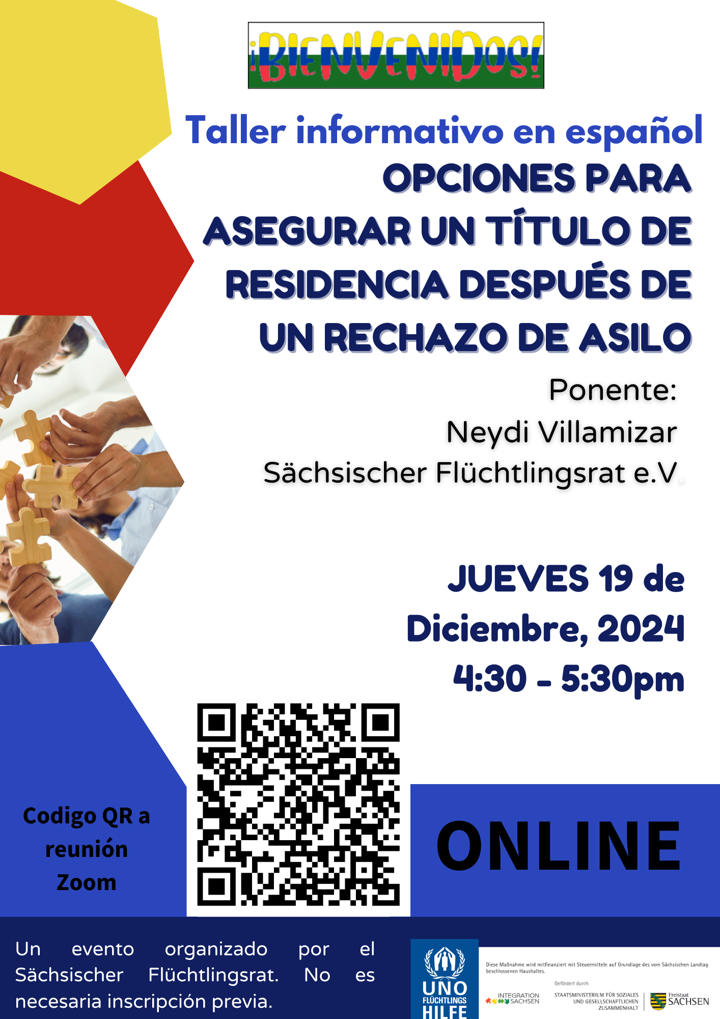 Neydi Villamizar, del proyecto „¡BIENVENIDOS!“, ofrecerá una visión general de las distintas opciones legales, desde la Duldung para la Ausbildung hasta el recién introducido „cambio de carril“ para trabajadores cualificados, que pueden utilizarse para obtener el derecho a permanecer en Alemania incluso después de que se haya rechazado una solicitud de asilo. El acto tendrá lugar digitalmente en la plataforma Zoom a través del enlace mencionado arriba. No se requiere inscripción previa.